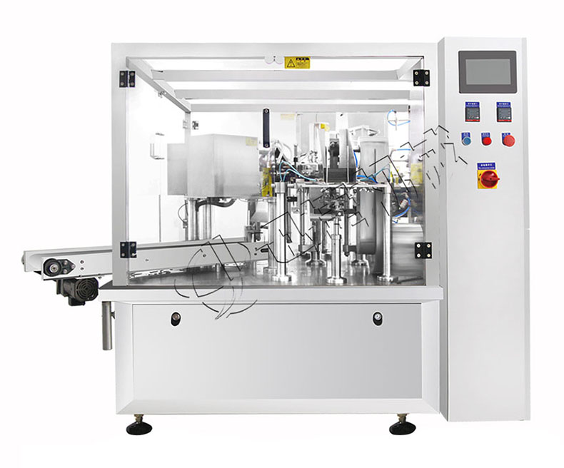 全自動給袋式醬料包裝機由給袋式包裝機、醬料灌裝機配套組成,帶醬(jiàng)料攪拌裝置,防止微顆粒物料(liào)沉澱,帶料位控製裝置。全自動給袋式醬料包裝機(jī)適用於包裝醬料、漿(jiāng)體物(wù)料,如烤肉醬、燒烤醬、番茄醬、辣椒醬、豆瓣醬等物料的袋裝。本全自動給袋式醬料包裝機符合食品加工機械的衛生標準。機器上與物料和包裝袋接觸(chù)的零部件均(jun1)采用符合食品衛生(shēng)要求的(de)材料加工,保證食(shí)品(pǐn)的衛生和安全。包裝袋類型有自立(lì)袋(dài)(帶拉鏈與不帶拉鏈(liàn))、平麵袋(三邊(biān)封、四邊封、手提袋、拉鏈袋)、紙袋等複合袋。