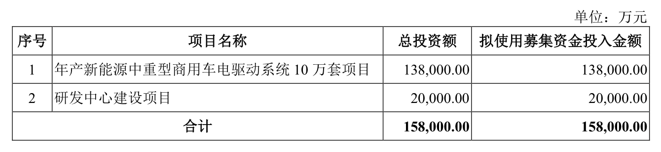 此番募投计划中的最大投入,便是新能源中重型商用车电驱动系统的扩产项目,拟投入金额高达13.8亿元。据悉,该项目建设期3年,建成达成后将合计年新增10万套电驱动系统产品。