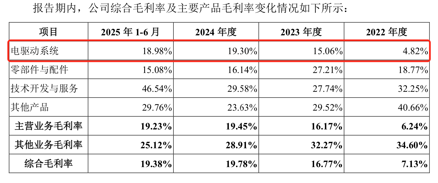 相应的,绿控传动毛利率表现也较为突出。公司主要产品电驱动系统(收入占比超95%)的毛利率从2022年的4.82%,陡然提升至2023年的15.06%,至2024年、2025年上半年也维持在19.3%、18.98%一线。这也使得绿控传动的综合毛利率从2022年的7.13%提升至2025年上半年的19.38%。